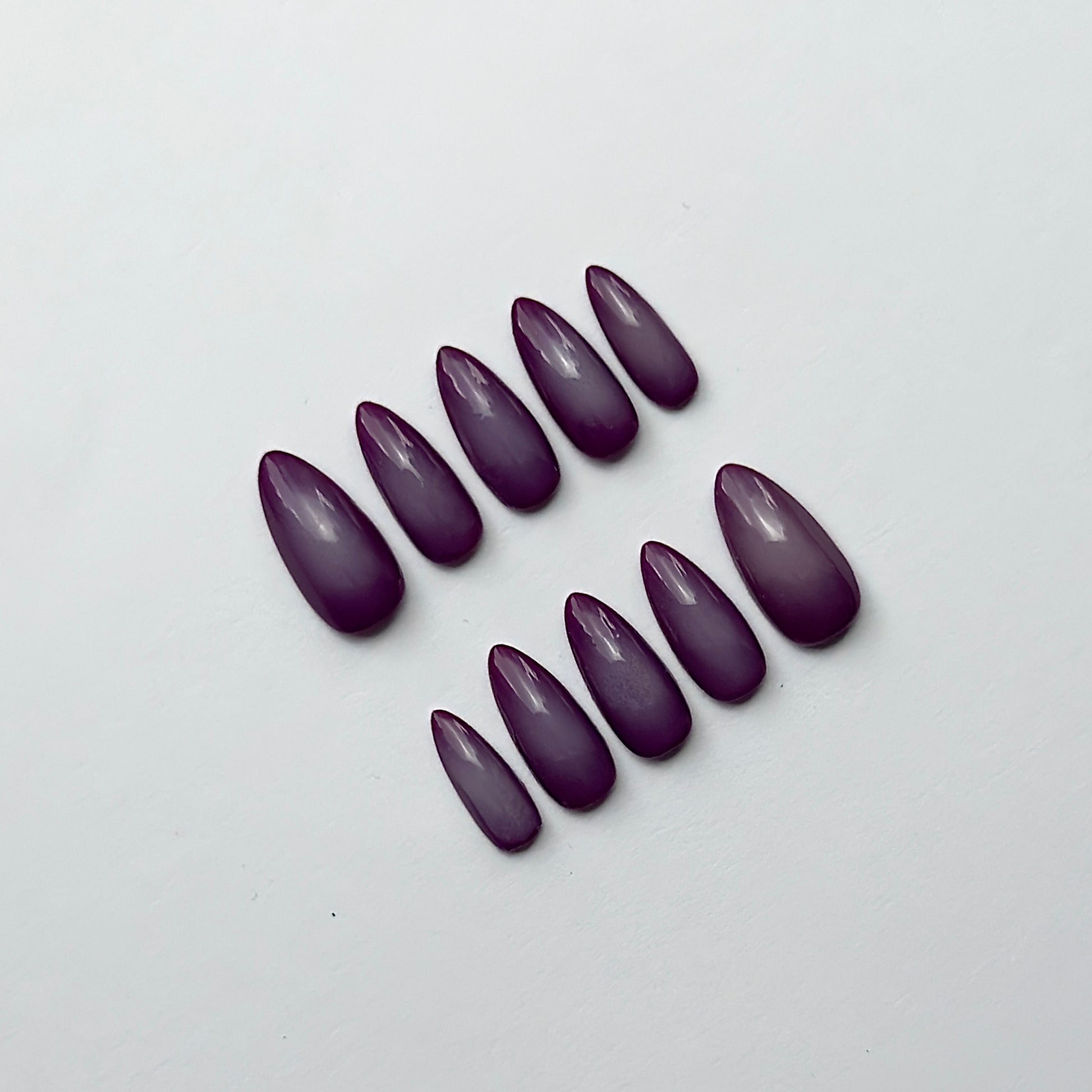 Purple aura ombre nails that blend vibrant violet into soft lavender like a dreamy sunset!