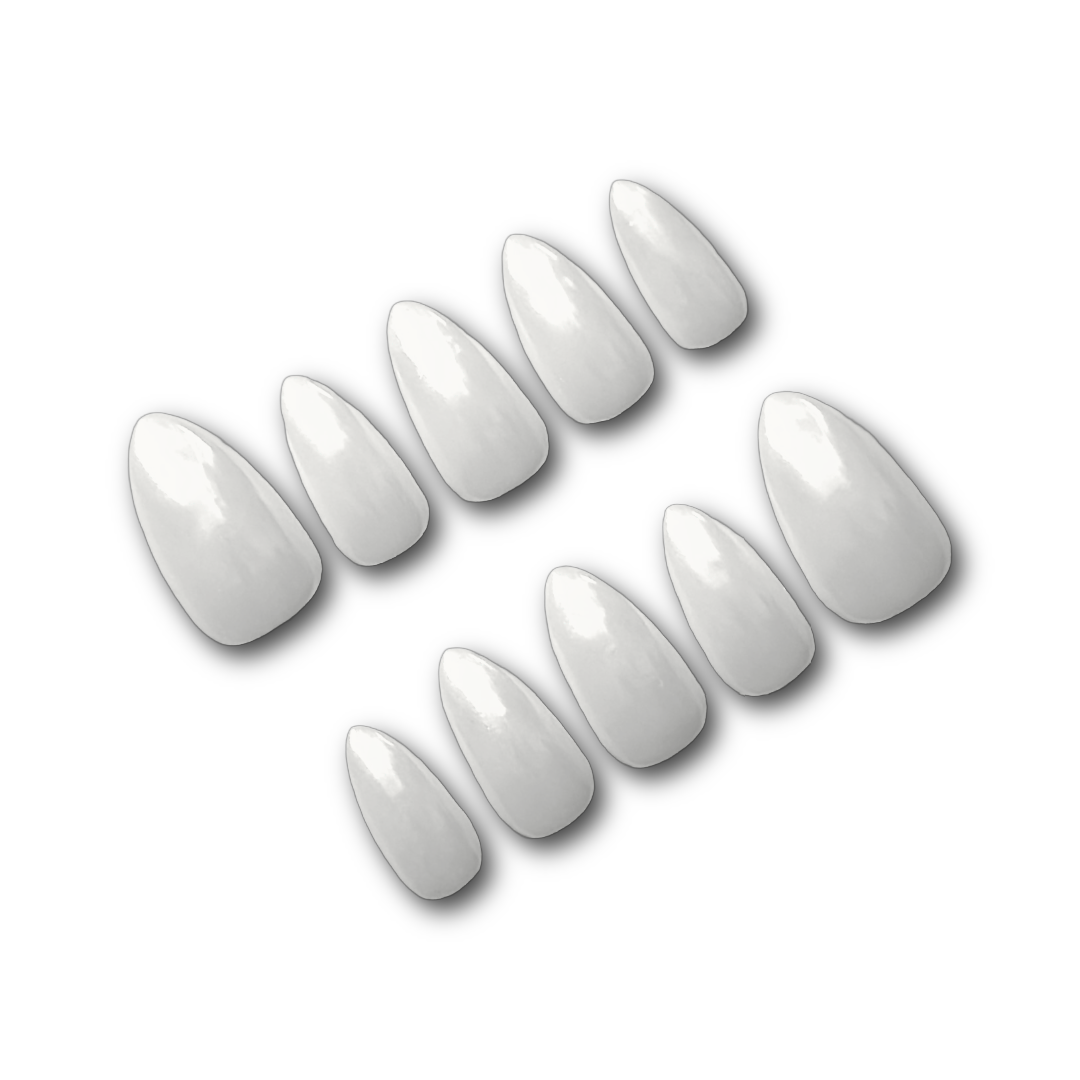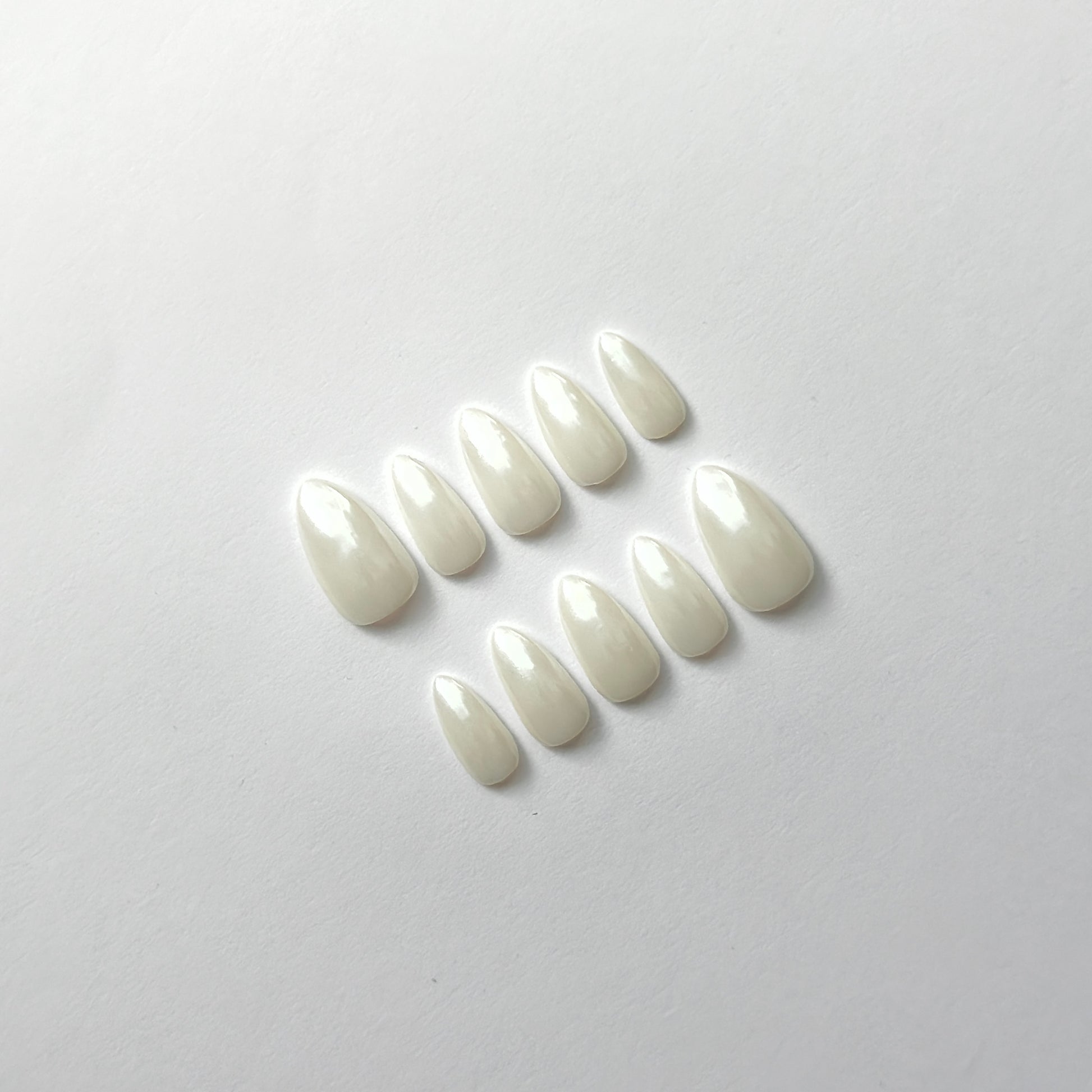 A sleek white chrome polish. Its reflective, pearlescent finish captures light from every angle, creating a soft, glassy glow. Perfect for a minimalist chic look or a bold statement!