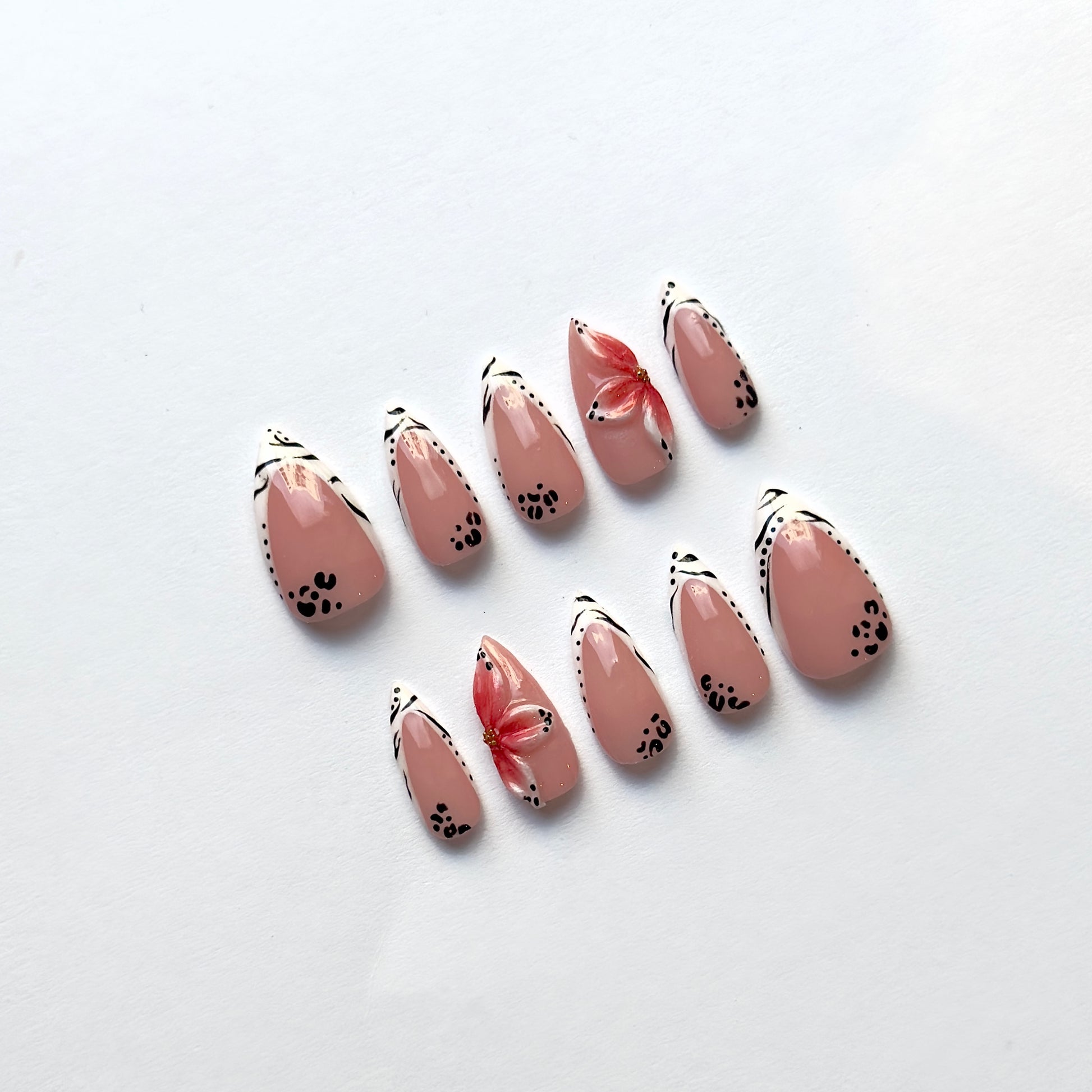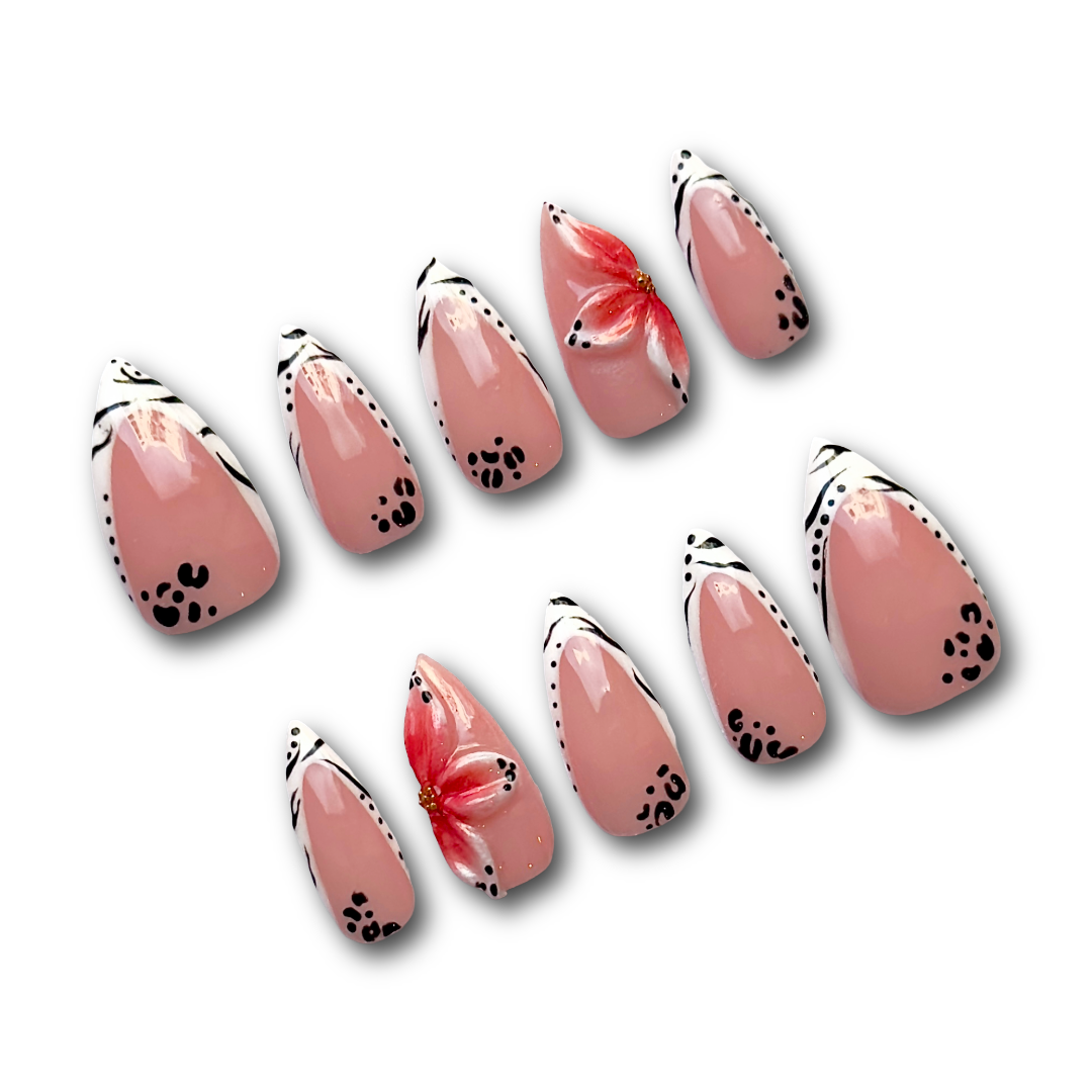Featuring bold black-and-white jungle-inspired tips on a soft nude base, each nail is accented with playful dotted details and a statement 3D blossom.