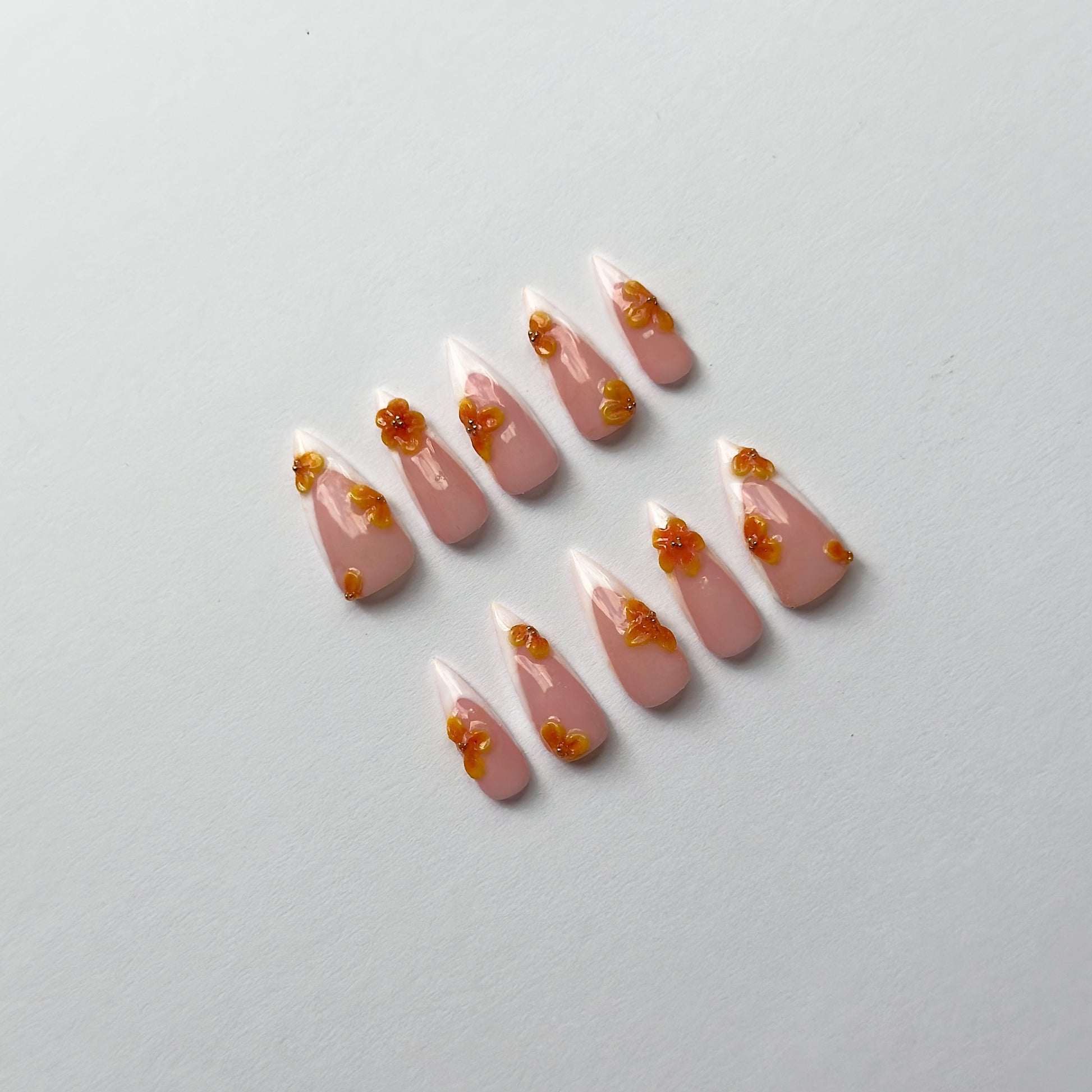 This set blends a soft pink base with crisp white tips, topped with 3D amber blossom flowers that look straight out of a summer sunset!